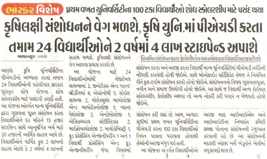 કૃષિલક્ષી સંશોધનને વેગ મળશે, કૃષિ યુનિ.માં પીએચડી કરતા તમામ ૨૪ વિદ્યાર્થીઓને ૨ વર્ષમાં ૪ લાખ સ્ટાઇપેન્ડ અપાશે