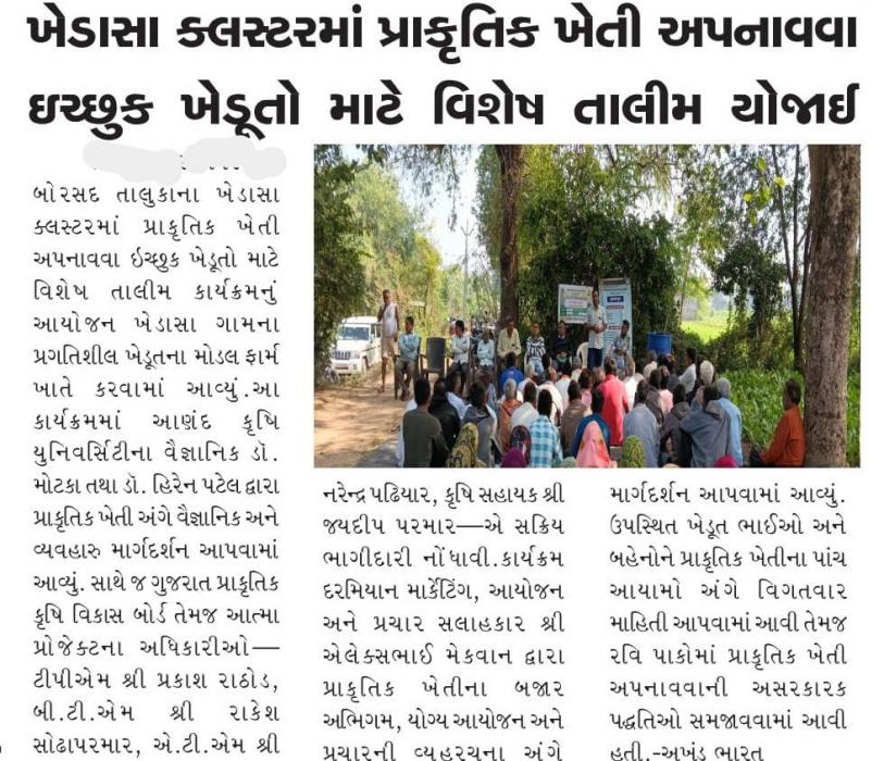 ખેડાસા કલસ્ટરમાં પ્રાકૃતિક ખેતી અપનાવવા ઇચ્છુક ખેડૂતો માટે વિશેષ તાલીમ યોજાઈ