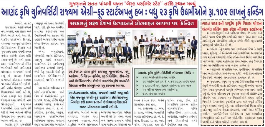 આણંદ કૃષિ યુનિવર્સિટી રાજ્યમાં એગ્રી-ફૂડ સ્ટાર્ટઅપનું હબ : વધુ ૨૩ કૃષિ ઉદ્યમીઓને રૂ. ૧૦૨ લાખનું ફન્ડિંગ