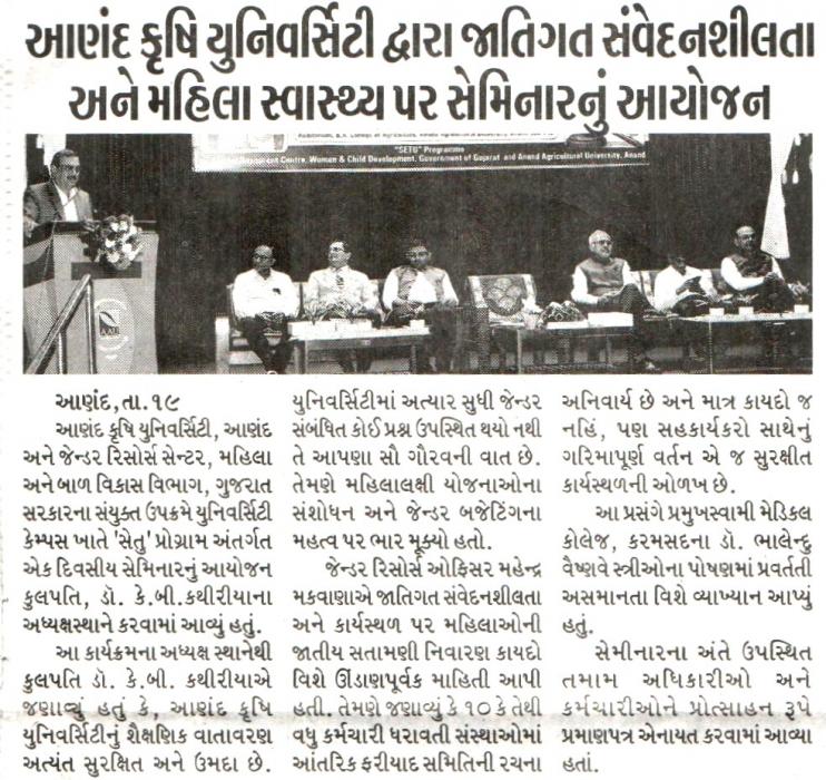 આણંદ કૃષિ યુનિવર્સિટી દ્વારા જાતિગત સંવેદનશીલતા અને મહિલા સ્વાસ્થ્ય પર સેમિનારનું આયોજન