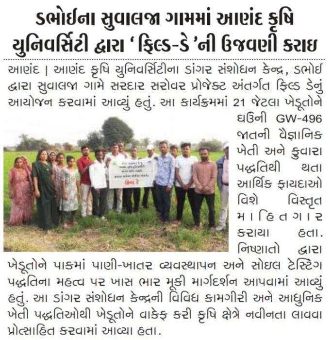 ડભોઈના સુવાલજા ગામમાં આણંદ કૃષિ યુનિવર્સિટી ધ્વારા ' ફિલ્ડ ડે ' ની ઉજવણી કરાઈ