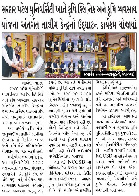 સરદાર પટેલ યુનિવર્સિટી ખાતે કૃષિ ક્લિનિક અને કૃષિ વ્યવસાય યોજના અંતર્ગત તાલીમ કેન્દ્રનો ઉદ્દઘાટન કાર્યક્રમ યોજાયો