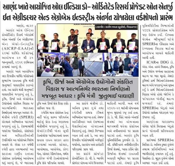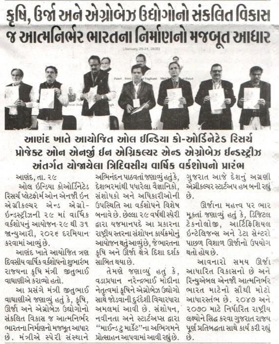 આણંદ ખાતે આયોજિત ઓલ ઇન્ડિયા કો-ઓર્ડીનેટેડ રિસર્ચ પ્રોજેક્ટ ઓન એનર્જી ઇન એગ્રીકલ્ચર એન્ડ એગ્રોબેઝ ઇન્ડસ્ટ્રીઝ અંતર્ગત યોજાયેલા વર્કશોપનો પ્રારંભ