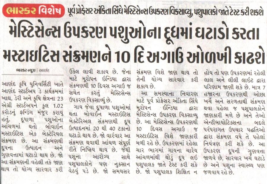 મેસ્ટીસેન્સ ઉપકરણ પશુઓના દૂધમાં ઘટડો કરતા મસ્ટાઇટિસ સંક્રમણને ૧૦ દિ અગાઉ ઓળખી કાઢશે