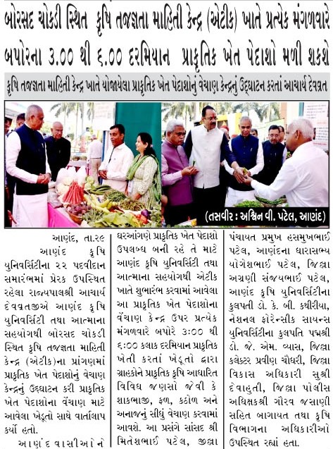 બોરસદ ચોકડી સ્થિત કૃષિ તજજ્ઞતા માહિતી કેન્દ્ર(એટીક) ખાતે પ્રત્યેક મંગળવારે બપોરના ૩.૦૦ થી ૬.૦૦ દરમિયાન પ્રાકૃતિક ખેત પેદાશો મળી શકશે