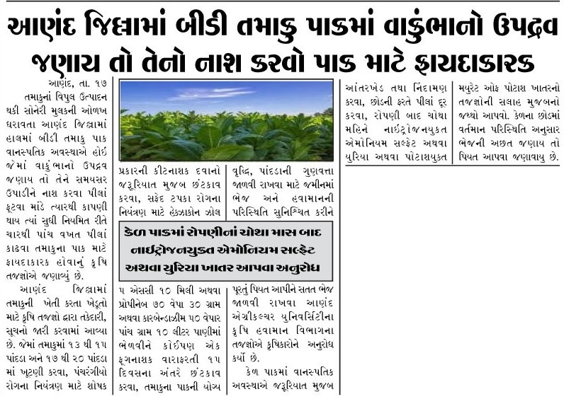 આણંદ જિલ્લામાં બીડી તમાકુ પાકમાં વાકુંભાનો ઉપદ્રવ જણાય તો તેનો નાશ કરવો પાક માટે ફાયદાકારક