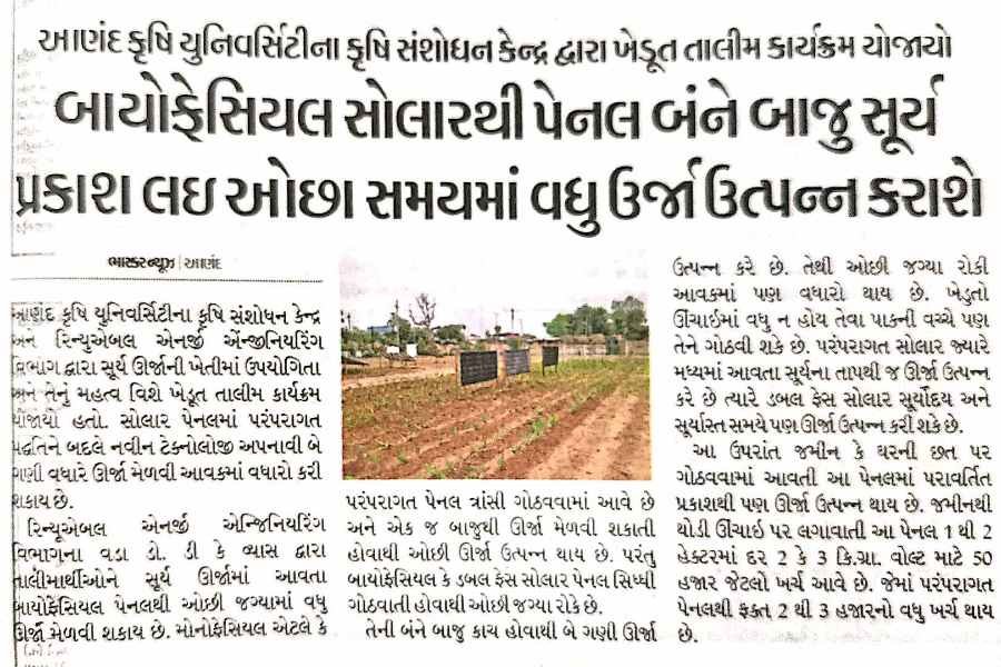 આણંદ કૃષિ યુનિવર્સિટીના કૃષિ સંશોધન કેન્દ્ર દ્વારા ખેડૂત તાલીમ કાર્યક્રમ યોજાયો. બાયોફેસિયલ સોલારથી પેનલ બંને બાજુ સૂર્ય પ્રકાશ લઈ ઓછા સમયમાં વધુ ઉર્જા ઉત્પન્ન કરાશે