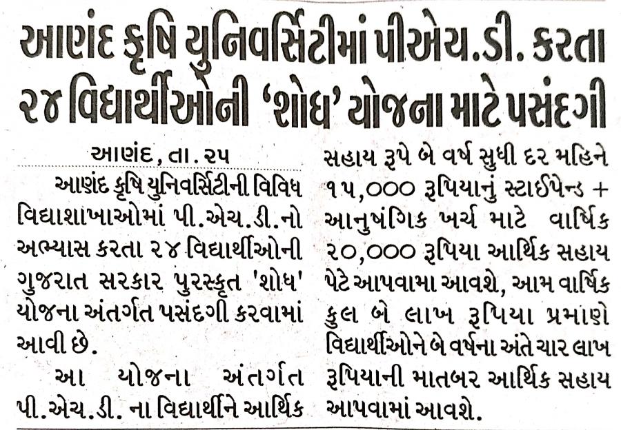 આણંદ કૃષિ યુનિવર્સિટીમાં પીએચ.ડી.કરતા ૨૪ વિદ્યાર્થીઓની 'શોધ' યોજના માટે પસંદગી