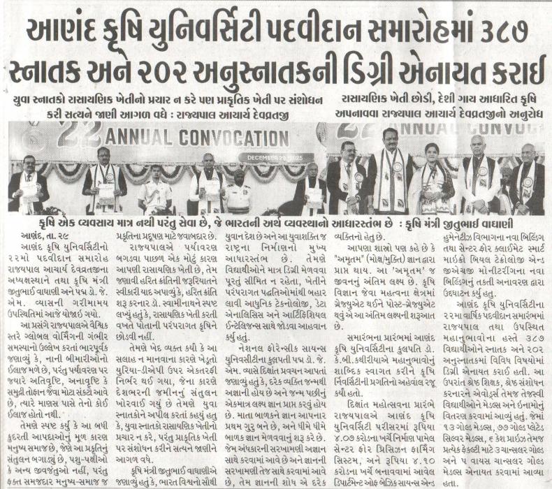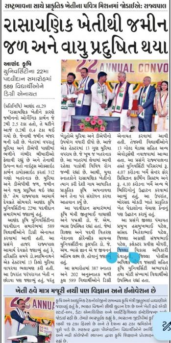 આણંદ કૃષિ યુનિ. ના ૨૨ માં પદવીદાન સમારોહમાં રાજ્યપાલ આચાર્ય દેવવ્રતે પ્રાકૃતિક ખેતી પર ભાર મુક્યો પ્રાકૃતિક ખેતી ભારતનું ભવિષ્ય: રાજ્યપાલ