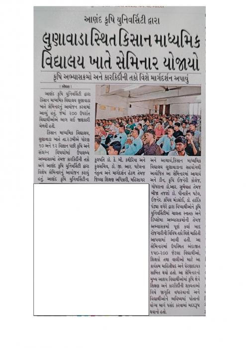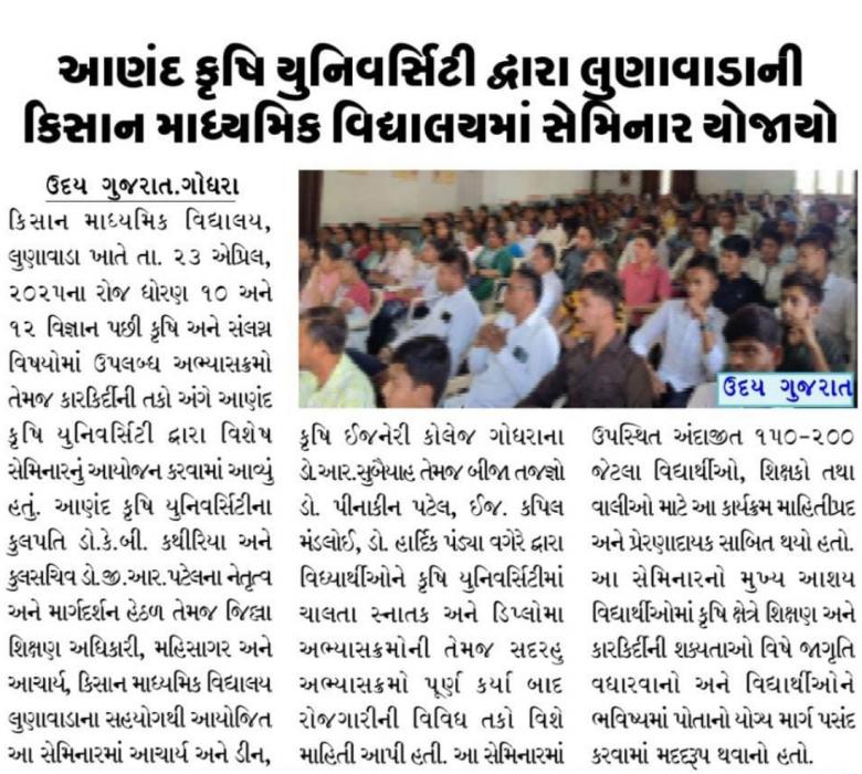 આણંદ કૃષિ યુનિવર્સિટી ધ્વારા લુણાવાડા સ્થિત કિસાન માધ્યમિક વિદ્યાલય ખાતે સેમિનાર યોજાયો