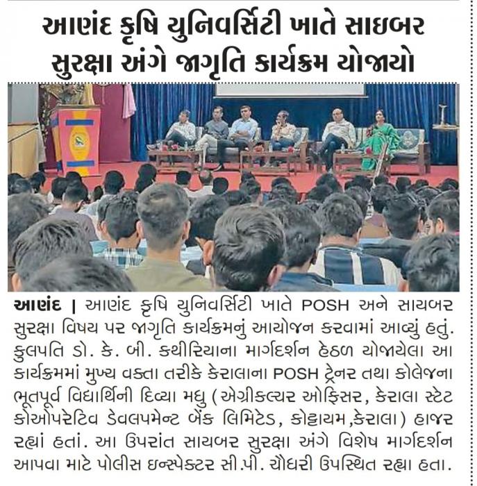આણંદ કૃષિ યુનિવર્સિટી ખાતે સાઈબર સુરક્ષા અંગે જાગૃતિ કાર્યક્રમ યોજાયો