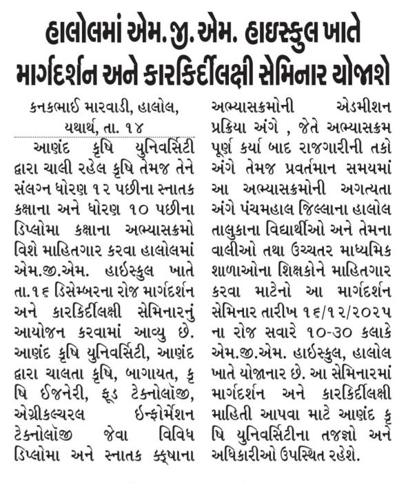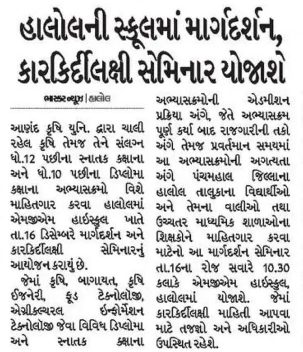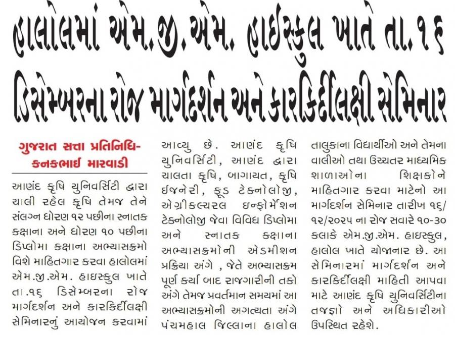 હાલોલમાં એમ.જી.એમ. હાઈસ્કુલ ખાતે ૧૬ ડિસેમ્બરના રોજ માર્ગદર્શન અને કારકિર્દીલક્ષી સેમિનાર