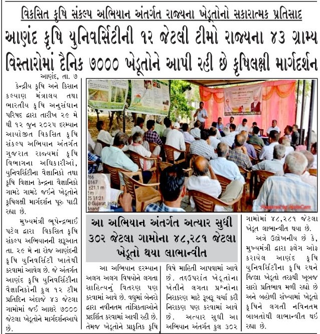 આણંદ કૃષિ યુનિવર્સિટીની ૧૨ જેટલી ટીમો રાજ્યના ૪૩ ગ્રામ્ય વિસ્તારોમાં દૈનિક ૭૦૦૦ ખેડૂતોને આપી રહી છે કૃષિલક્ષી માર્ગદર્શન