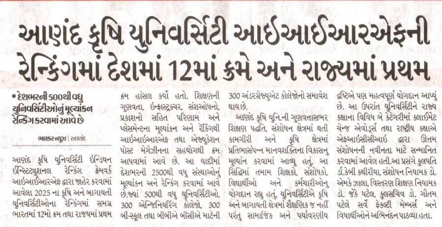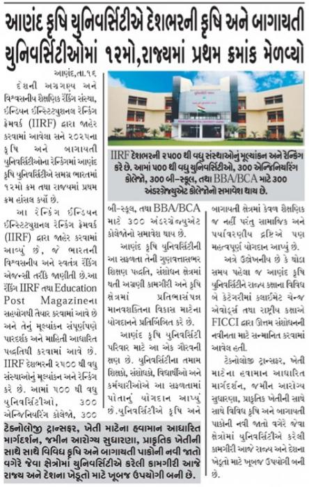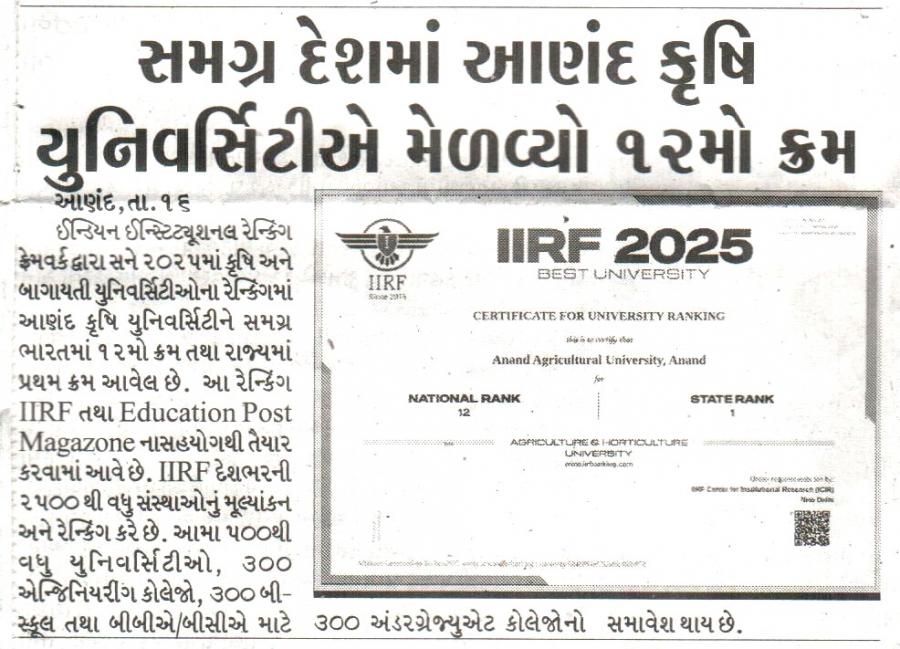 આણંદ કૃષિ યુનિવર્સિટી આઇઆઈઆરએફની રેન્કિંગમાં દેશમાં ૧૨માં ક્રમે અને રાજ્યમાં પ્રથમ