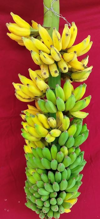 The variety has medium plant height with early maturity and conical shape with loose bunch. Fruits are medium in size with slightly curved shape. Average fruit weight 99.3 g. Higher carotenoid (3.64 mg/100g) and reducing sugar (2.51%) as well as lower crude fiber (1.66%) higher Fe (32.10 mg/kg) and Zn (9.16 mg/kg) content. On the basis of traders’ opinion, this dessert type banana variety Prasadam fetches about 5 times more price than cavendish Banana Grand Naine.</p>